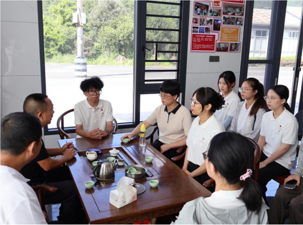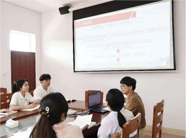 為此,實踐隊走進捷文村,與村委會干部組織召開學習交流座談會。會上,村支書李財林向?qū)嵺`隊師生分享林改經(jīng)驗,說道:“自2001年首次在捷文村試行林改,到如今經(jīng)歷了20多年,將家庭聯(lián)產(chǎn)承包責任制從山下落實到山上,以分山到戶的模式,在林業(yè)體制機制創(chuàng)新中,武平率先推行抵押、擔保、授信‘三管齊下’,為林業(yè)發(fā)展提供融資服務,大力發(fā)展林下經(jīng)濟,對于山多于田的情況,進行創(chuàng)林育林,解決百姓的收入來源問題,至2023年村民可支配年收入達31315元。林改的過程中,武平縣不斷吸取經(jīng)驗,探索林改‘升級’新途徑—生態(tài)金融產(chǎn)品‘碳金卡’,以‘碳匯銀行’為平臺的林業(yè)碳匯和碳普惠激勵機制,讓莽莽群山成為林農(nóng)的‘幸?可’。”