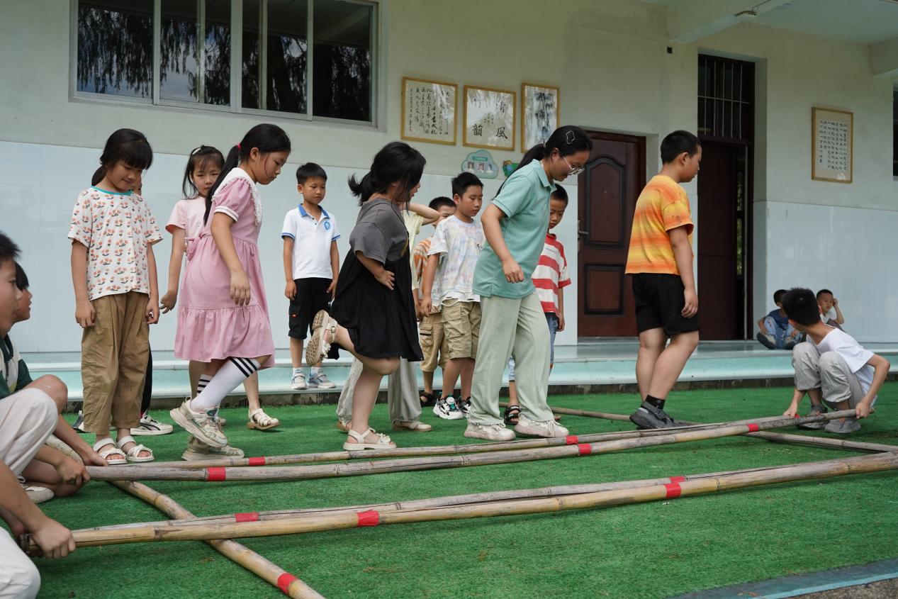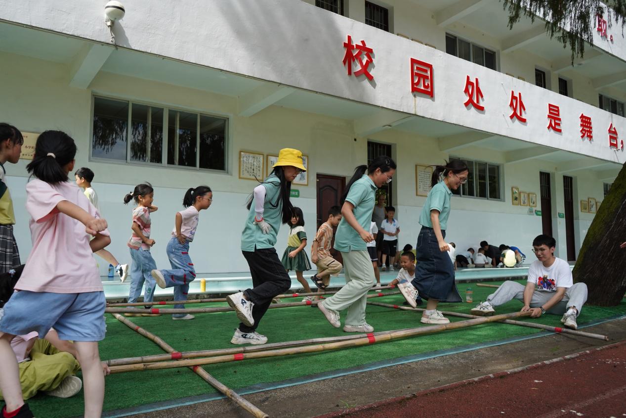 課程之余,實踐團(tuán)成員還與孩子們一道跳起竹竿舞,在當(dāng)?shù)刂窬幨炙嚾酥x師傅的帶領(lǐng)下學(xué)習(xí)竹編、竹樂器等活動,共同感受“竹之韻”。