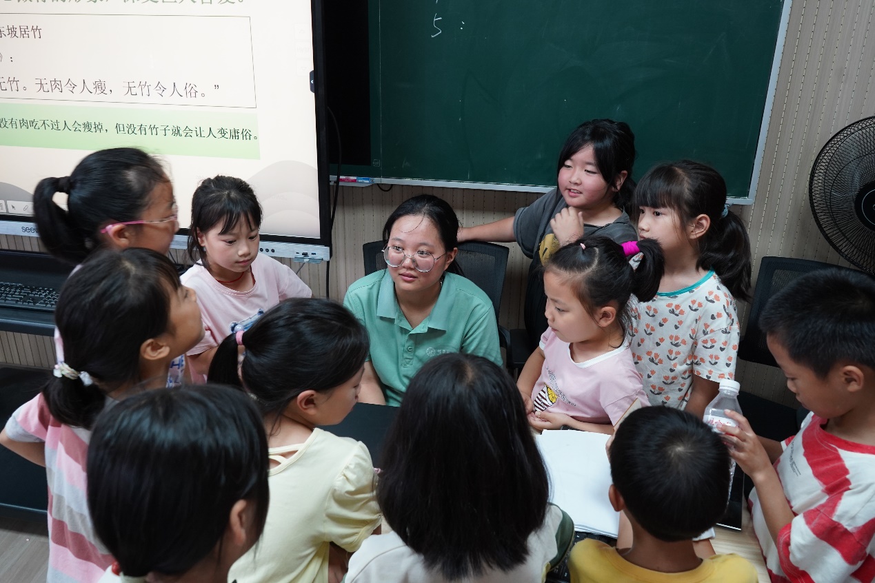 竹子因其特有的形態(tài)結(jié)構(gòu)與生長特性,被人們賦予了諸多美好的寓意。實踐團(tuán)成員自先秦至近代,從二言到絕句,講解各類詠竹詩句,既有贊美君子如淇水綠竹般的《詩經(jīng)·淇奧》,也有強(qiáng)調(diào)應(yīng)當(dāng)與竹為友以脫俗的《與潛僧綠筠軒》,這些詩歌詳盡地向孩子們展現(xiàn)了文字中的“竹之韻”。