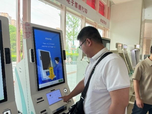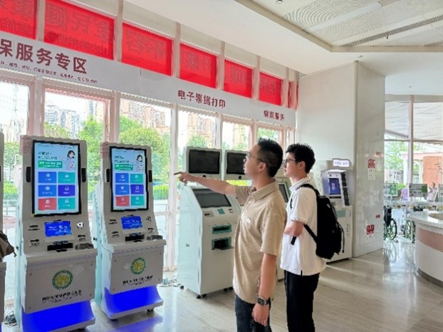訪談結(jié)束后,團隊成員在黃裕翔老師的帶領(lǐng)下,參觀并體驗了華西二院(錦江院區(qū))的自助服務終端及病案自助打印終端,黃裕翔老師重點介紹了華西二院的醫(yī)保無感支付業(yè)務的操作流程。