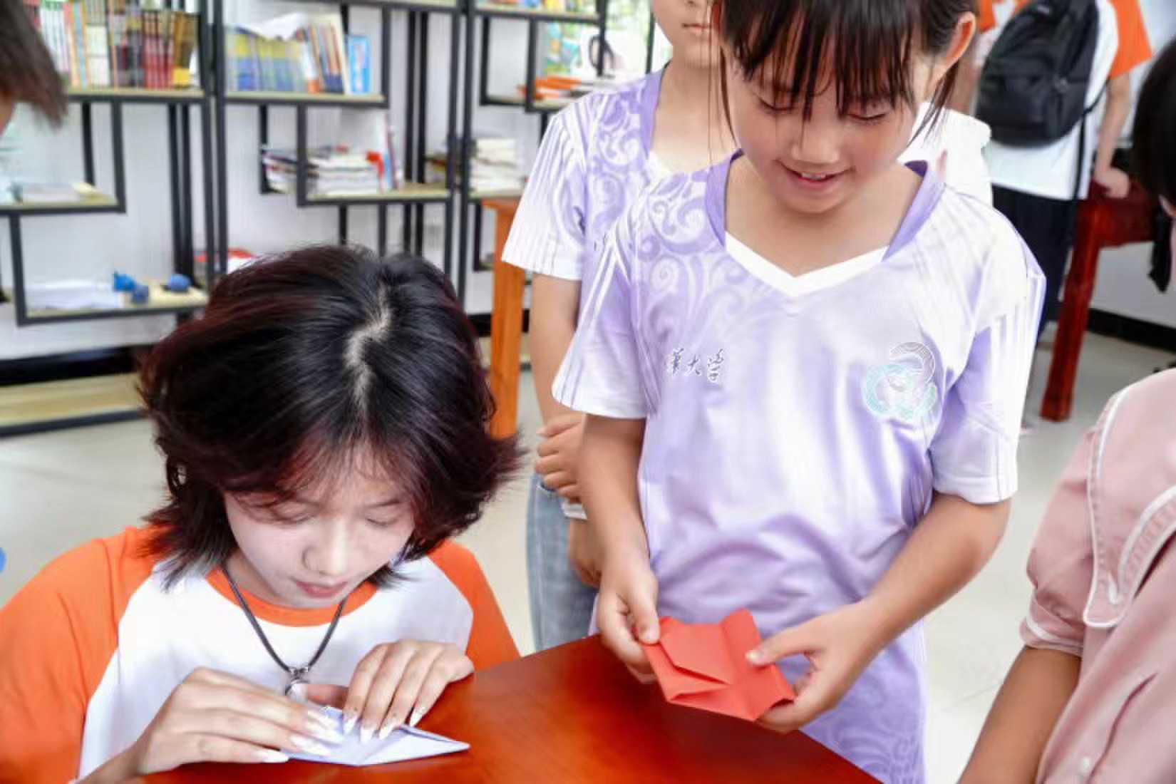 最后一節(jié)課是美術(shù)課。成員們提前準(zhǔn)備了一些卡紙并分發(fā)下去,由成員們?cè)谥v臺(tái)上教,孩子們?cè)谙旅鎸W(xué),對(duì)于折紙孩子們表現(xiàn)出極大熱情,每一個(gè)人都積極回應(yīng)。