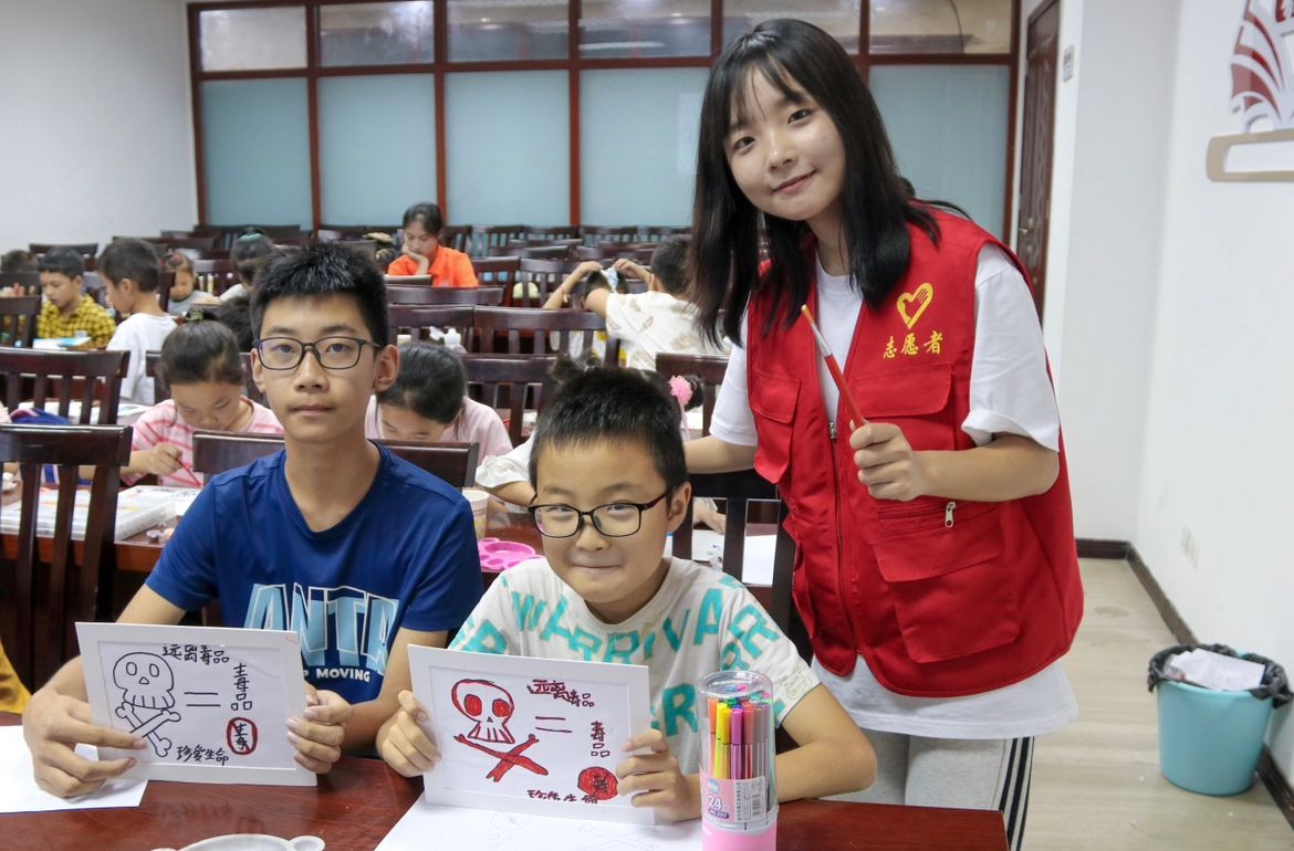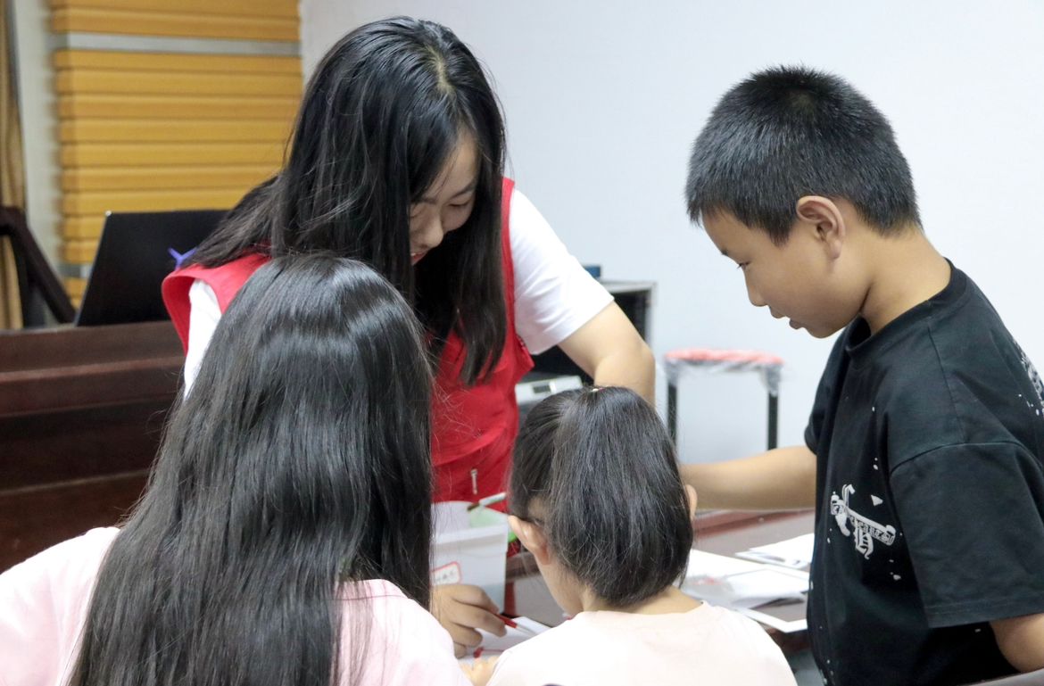 圖為“薪火相傳 代代守護(hù)”實(shí)踐隊(duì)成員耐心教學(xué)小朋友繪制禁毒宣傳畫。