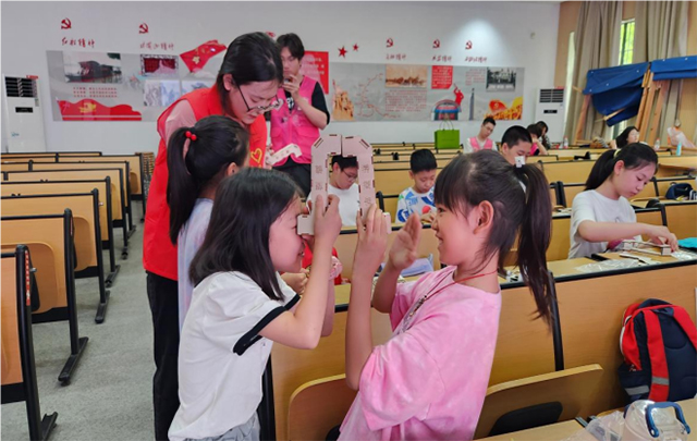 為了讓孩子們更深入地體驗光的奇妙,方便理解光的直線傳播、光的反射和折射定律,課程還特別設(shè)置“制作潛望鏡”實踐操作環(huán)節(jié)。小朋友們在方圓的指導(dǎo)下,他們小心翼翼地操作著,每當(dāng)組裝完成,一張張小臉上都洋溢著成功的喜悅和自豪。