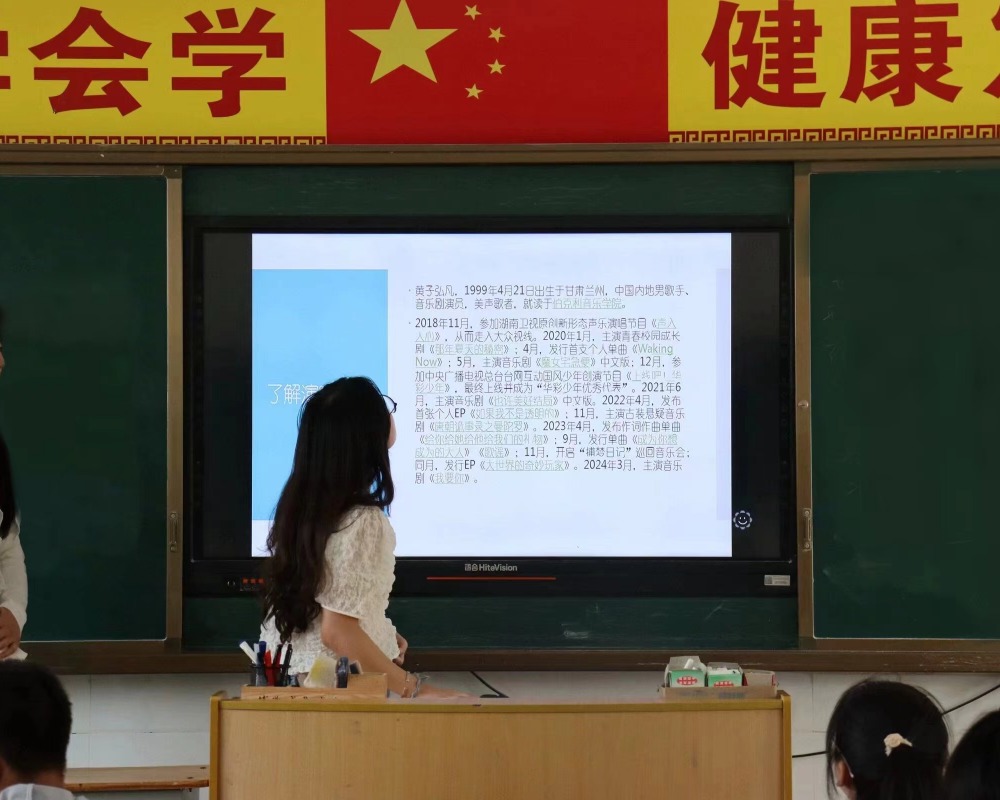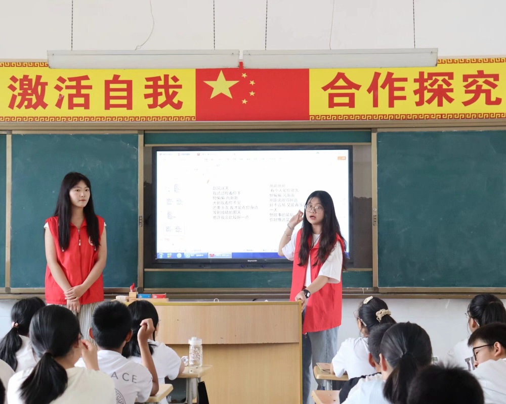 隨后,志愿者帶領(lǐng)學(xué)生們歌唱,聆聽每一個音符的跳躍,學(xué)生們或引吭高歌,或小聲跟唱,不同的音色交織在一起便是天籟之曲。志愿者對所有的學(xué)生施以鼓勵,一開始害羞內(nèi)斂的孩子也逐漸放開了聲音,歌聲響徹整個教室。在每一遍唱罷后,志愿者及時糾正孩子們的發(fā)音誤區(qū),順?biāo)浦鄣仄占皹防淼幕A(chǔ)知識。一雙雙充滿好奇的眼睛,一張張寫滿期待的面龐,當(dāng)歡快的旋律響起時,在志愿者溫潤的嗓音起伏時,一切都化為了專注認(rèn)真,傳達(dá)著深切的向往,涌動著真摯的傾訴。