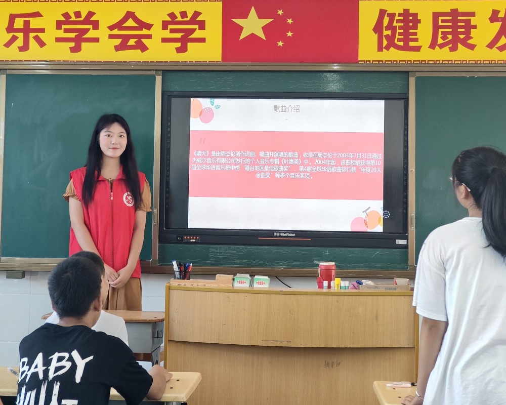 志愿者提前征集學(xué)生們的意愿,在課堂上教授《無名的人》、《晴天》等深受學(xué)生喜愛的歌曲,極大地調(diào)動了他們的積極性。志愿者教授歌曲前先補(bǔ)充了創(chuàng)作背景、主題情感等其他知識,拓展孩子們的知識面,并對部分作品進(jìn)行賞析,提高孩子們的審美能力,不僅要在音樂的律動方面感染他們,更要從深層次的文化背景方面深化他們對音樂的感觸,使學(xué)生從簡單的喜歡會唱到熱愛與享受,放聲的高歌是身心的共舞,是從外到內(nèi)的靈魂振動。