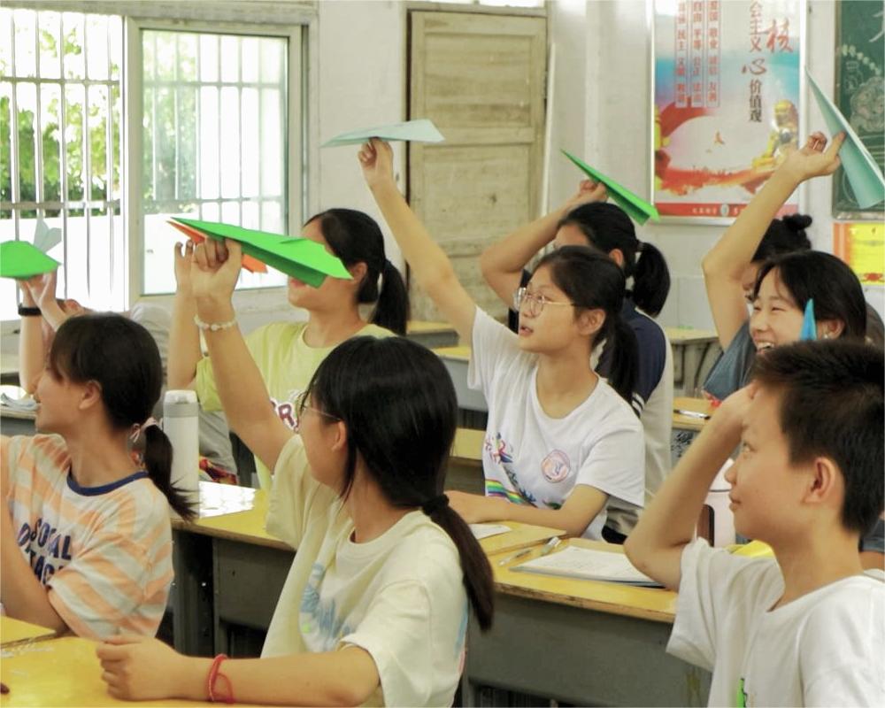 夢(mèng)想課堂的最后,志愿者們讓同學(xué)們?cè)诓始埳蠈?xiě)下自己的夢(mèng)想,再將彩紙疊成一架小小的飛機(jī),握在手中,舉過(guò)頭頂,朝前擲出。隨著紙飛機(jī)破開(kāi)空氣滑行,屬于他們的精彩人生也翻開(kāi)了第一章?扉T(mén)定格下這美好的一刻,畫(huà)面中同學(xué)們發(fā)自內(nèi)心的笑容燦爛如七月驕陽(yáng)。