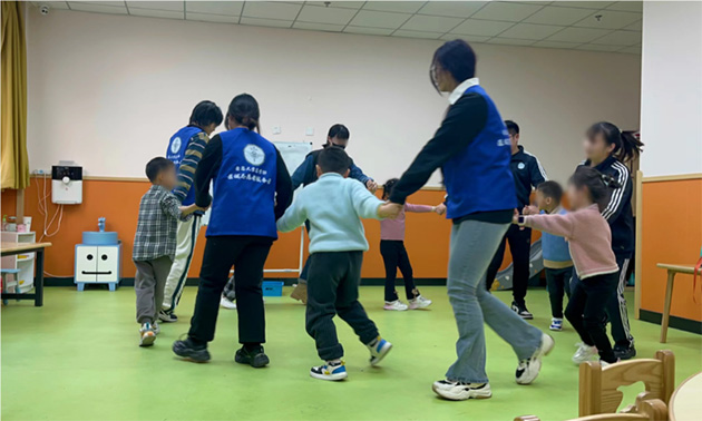 圖為成員們輔助孤獨癥兒童完成課堂活動