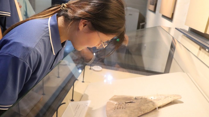 殷都燦爛的文明以都市、文字、青銅器為標(biāo)志。步入殷墟博物館,實(shí)踐隊(duì)隊(duì)員們仔細(xì)觀摩珍貴的文物和歷史資料,欣賞精美絕倫的藝術(shù)珍品,沉浸在琳瑯滿目的瑰寶奇觀世界之中。從嵌綠松石甲骨刻辭骨柶到各類甲骨文骨片,從司母辛鼎到亞長(zhǎng)墓出土的青銅鉞,實(shí)踐隊(duì)隊(duì)員仿佛穿越時(shí)空“與文物對(duì)話”,切身感受古老神秘的商代文明,深刻致敬中華文明的深厚底蘊(yùn)。殷墟為世人見證了商文化的精髓,它的每一片甲骨都是一段歷史的解碼,每一尊青銅器都是一個(gè)真實(shí)的傳說,記載著殷商古城說不盡的前塵往事。