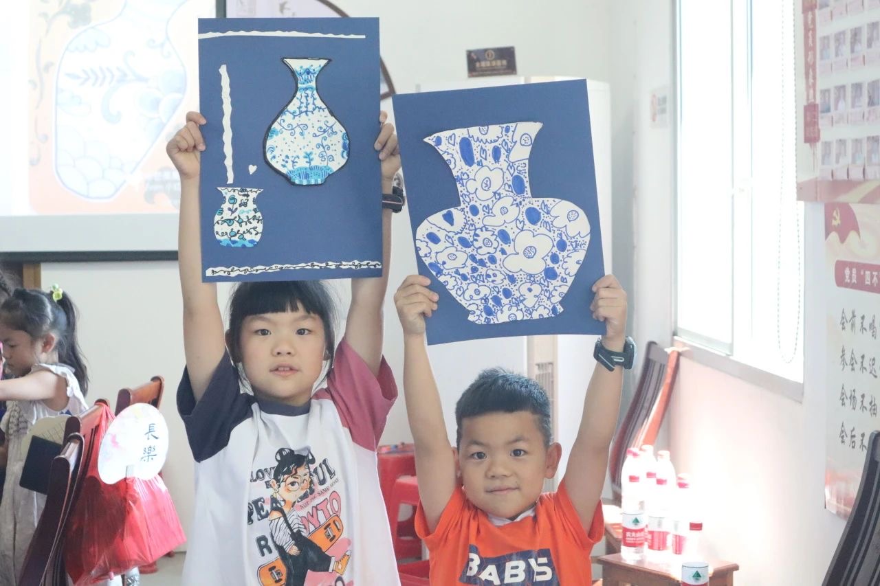 “九秋風露越窯開,奪得千峰翠色來。”課堂開始,葉老師為孩子們講解了青花瓷的歷史與意義。接著,葉老師又利用彩紙、剪刀和膠水,引導孩子們創(chuàng)作出富有青花瓷風格的作品。課堂上,孩子們的小手巧妙地剪裁、拼貼,每一次錯誤的嘗試都成為發(fā)現(xiàn)新可能的契機。隨著一幅幅生動的青花瓷作品的完成,孩子們眼中閃爍著成就感與自豪。相遇非遺,相約非遺,支教老師的創(chuàng)新方法為孩子們帶來了知識的光芒,也為他們的成長播下了文化的種子。