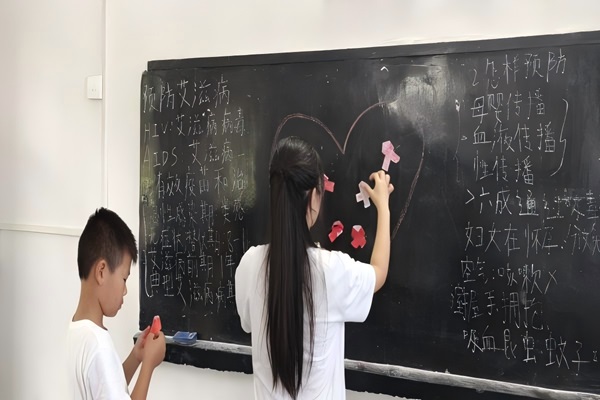 值得一提的是,為了讓學(xué)生親身體驗(yàn)參與預(yù)防艾滋病的過(guò)程,志愿者組織學(xué)生制作象征艾滋病防治的紅絲帶。盡管面臨物資限制,學(xué)生們利用紅紙精心制作紅絲帶,對(duì)此活動(dòng)表現(xiàn)出了極高的參與熱情。活動(dòng)后期,孩子們親手將自己制作的紅絲帶粘貼在教室黑板上繪畫(huà)的愛(ài)心圖案中。一方面這一舉動(dòng)體現(xiàn)了他們對(duì)艾滋病的深刻理解與關(guān)注,展現(xiàn)了他們關(guān)愛(ài)他人、尤其是艾滋病毒感染者和患者的溫暖情懷。這反映了孩子們?cè)谇楦信c認(rèn)知上的成長(zhǎng),通過(guò)實(shí)際行動(dòng)傳遞了對(duì)受影響群體的支持與接納,同時(shí)也增強(qiáng)了孩子們的社會(huì)歸屬感和自我價(jià)值認(rèn)同。另一方面志愿者希望通過(guò)這次活動(dòng)深入普及艾滋病防治意識(shí)和深切關(guān)懷弱勢(shì)群體。通過(guò)這樣的互動(dòng),志愿者們用自己的行動(dòng)示范了社會(huì)責(zé)任感,同時(shí)也為孩子們樹(shù)立了正面的榜樣,讓他們?cè)趯?shí)踐中學(xué)會(huì)尊重生命、關(guān)愛(ài)他人,進(jìn)而促進(jìn)了整個(gè)社會(huì)對(duì)艾滋病感染者和病人的接納和支持。