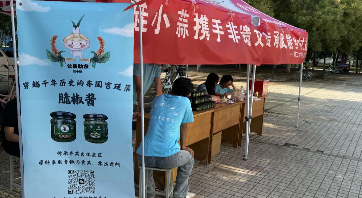 為傳承齊菜文化底蘊,發(fā)揚齊風魯韻,傳播非遺味道,深入落實為農(nóng)民服務、為百姓謀福利,實現(xiàn)團隊社會實踐的目的宗旨,7月20日至7月21日,山東理工大學生命與醫(yī)藥學院硅小蒜科技助農(nóng)團在山東理工大學(西校區(qū))第三餐廳門口進行助農(nóng)產(chǎn)品脆椒醬的售賣活動。