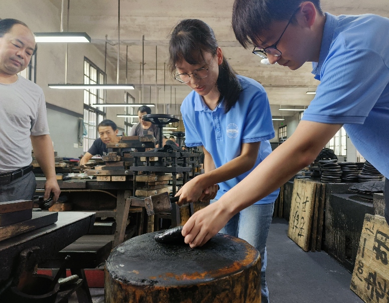 團(tuán)隊(duì)成員在師傅指點(diǎn)下捶打墨胚。章成凱/攝