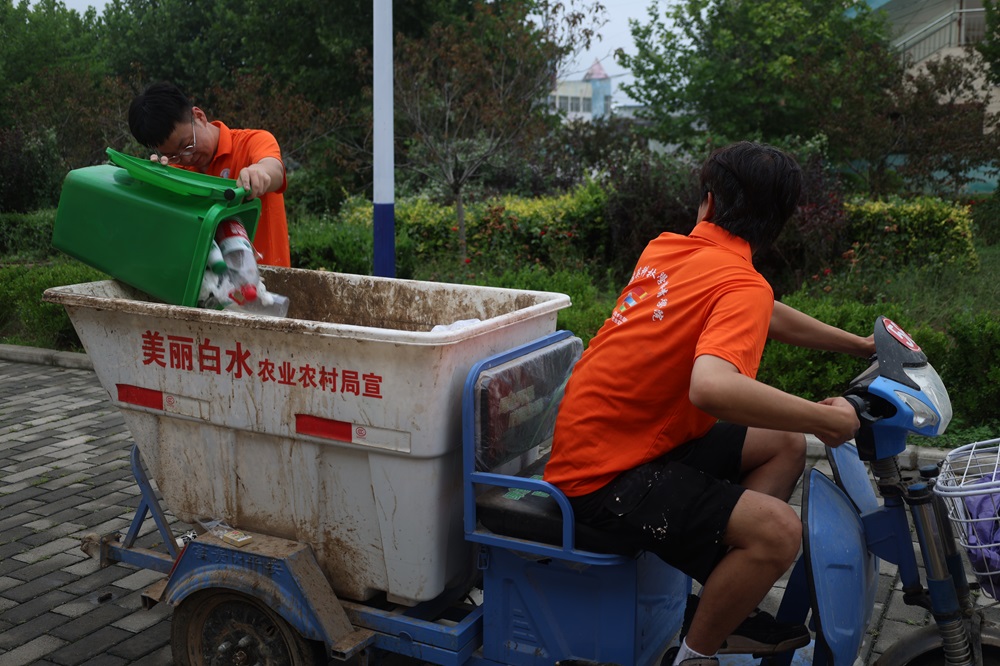 再次,團隊成員還協(xié)助村民進行了垃圾轉運清理工作,他們手持清掃工具,推著垃圾清運車,改善了村莊的衛(wèi)生狀況。