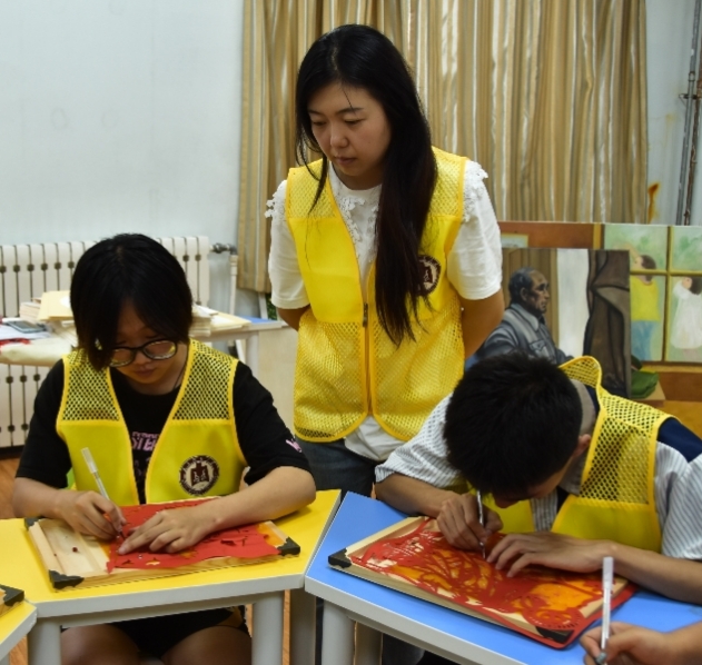 圖為老師指導(dǎo)實踐隊員學(xué)習(xí)剪紙 通訊員 崔震奇 供圖