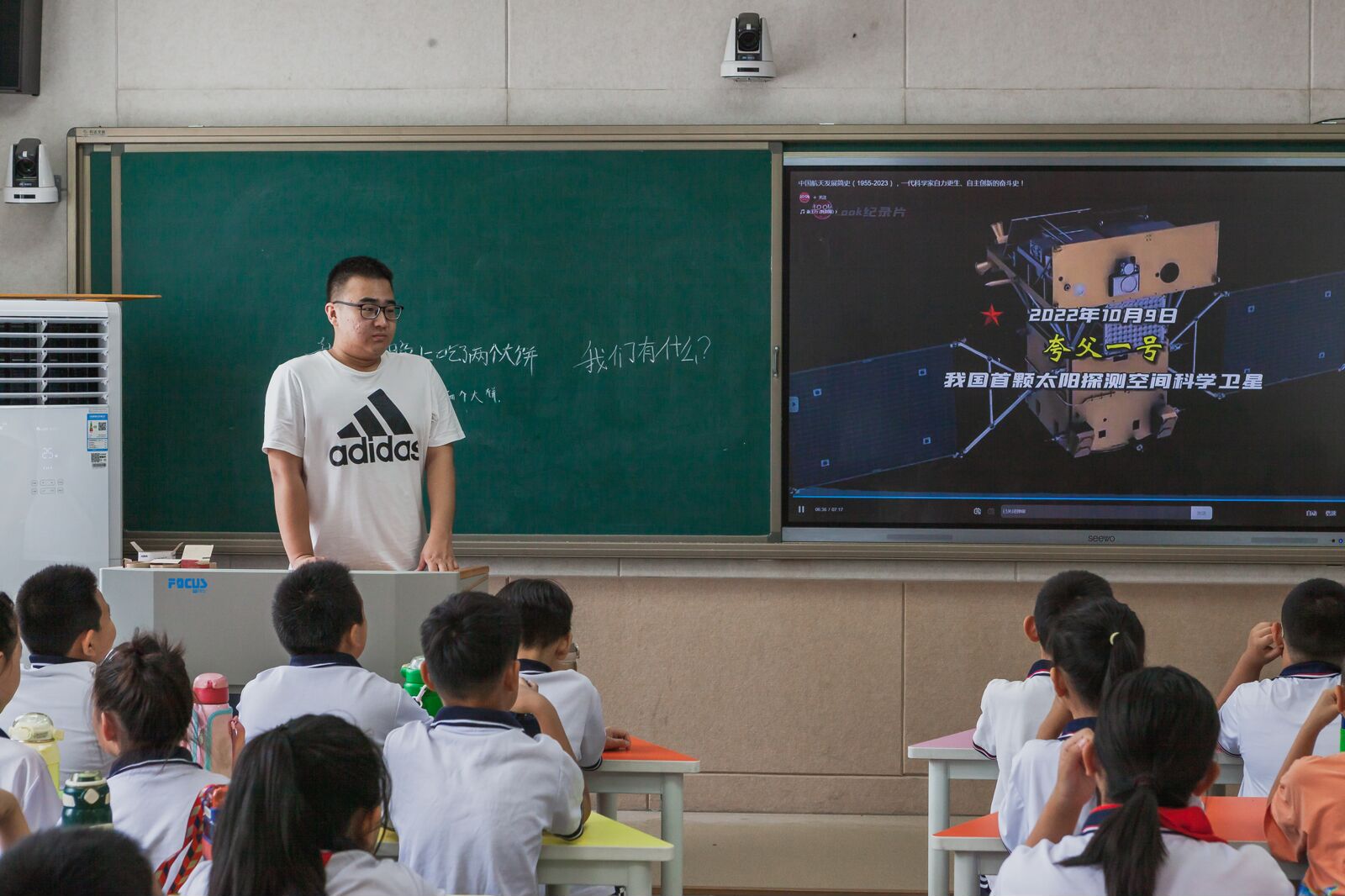 在《中國航天發(fā)展史》的課堂上。孩子們隨著隊(duì)員的腳步一同回溯這70年史詩長卷。隊(duì)員展示了新中國在一窮二白,外部強(qiáng)敵環(huán)伺的艱苦環(huán)境中,中國航天人從零開始,不懼挑戰(zhàn),獨(dú)立自主探索航天事業(yè)。帶著信心與細(xì)心,歷經(jīng)失敗,走過至暗時(shí)刻,從東風(fēng)紅的成功發(fā)射到如今天問一號(hào)著陸火星,最終創(chuàng)造了我國航天事業(yè)的輝煌成就。