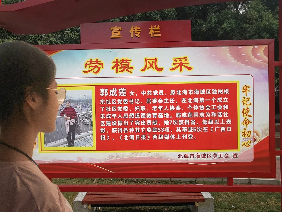 在參觀過程中,踐行社會主義核心價值觀,實踐隊員積極弘揚基層群眾中的勞模精神、勞動精神和工匠精神,培育社會主義文明新風(fēng)尚,市總工會、海城區(qū)總工會2019年12月在獨樹根東社區(qū)開始建立英模廣場,英模廣場主體部分位于獨樹根東社區(qū)文化廣場舞臺后面,占地面積約1035平米,展示了基層群眾中的15名勞模先進(jìn)事跡。
