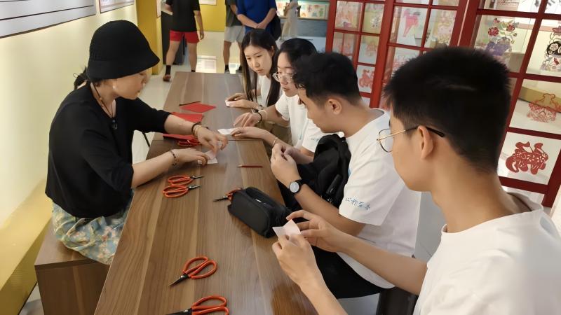 在參觀與采訪后,實(shí)踐團(tuán)成員為了加深對(duì)剪紙藝術(shù)的理解,在博物館的工作人員的教學(xué)下,親身體驗(yàn)剪紙藝術(shù)。實(shí)踐團(tuán)成員從簡單的傳統(tǒng)紋飾學(xué)起,深入感受剪紙文化的內(nèi)涵。