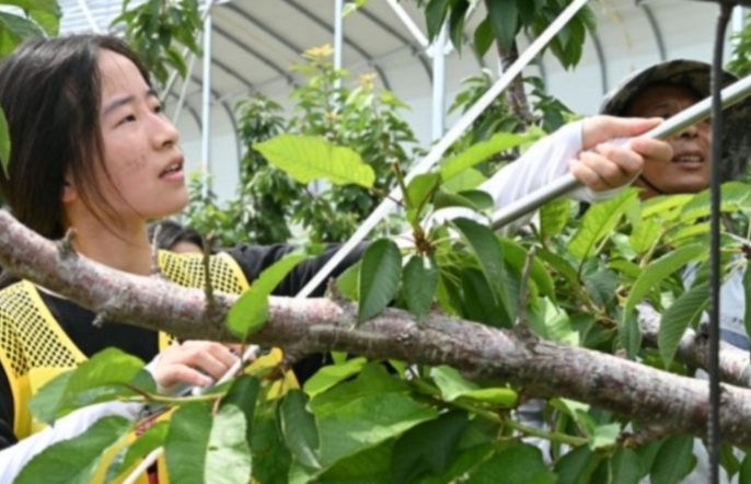 圖為實踐隊員修剪果樹 彭藝菲 攝