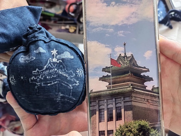 在觀賞當(dāng)?shù)貤飨阌∪竞砂髌窌r,實踐團驚喜地發(fā)現(xiàn)其中一荷包上繪制的花紋是南京農(nóng)業(yè)大學(xué)的主樓。南農(nóng)與麻江的深厚情感,被當(dāng)?shù)亟橙饲擅钊谌胱髌分小?br />