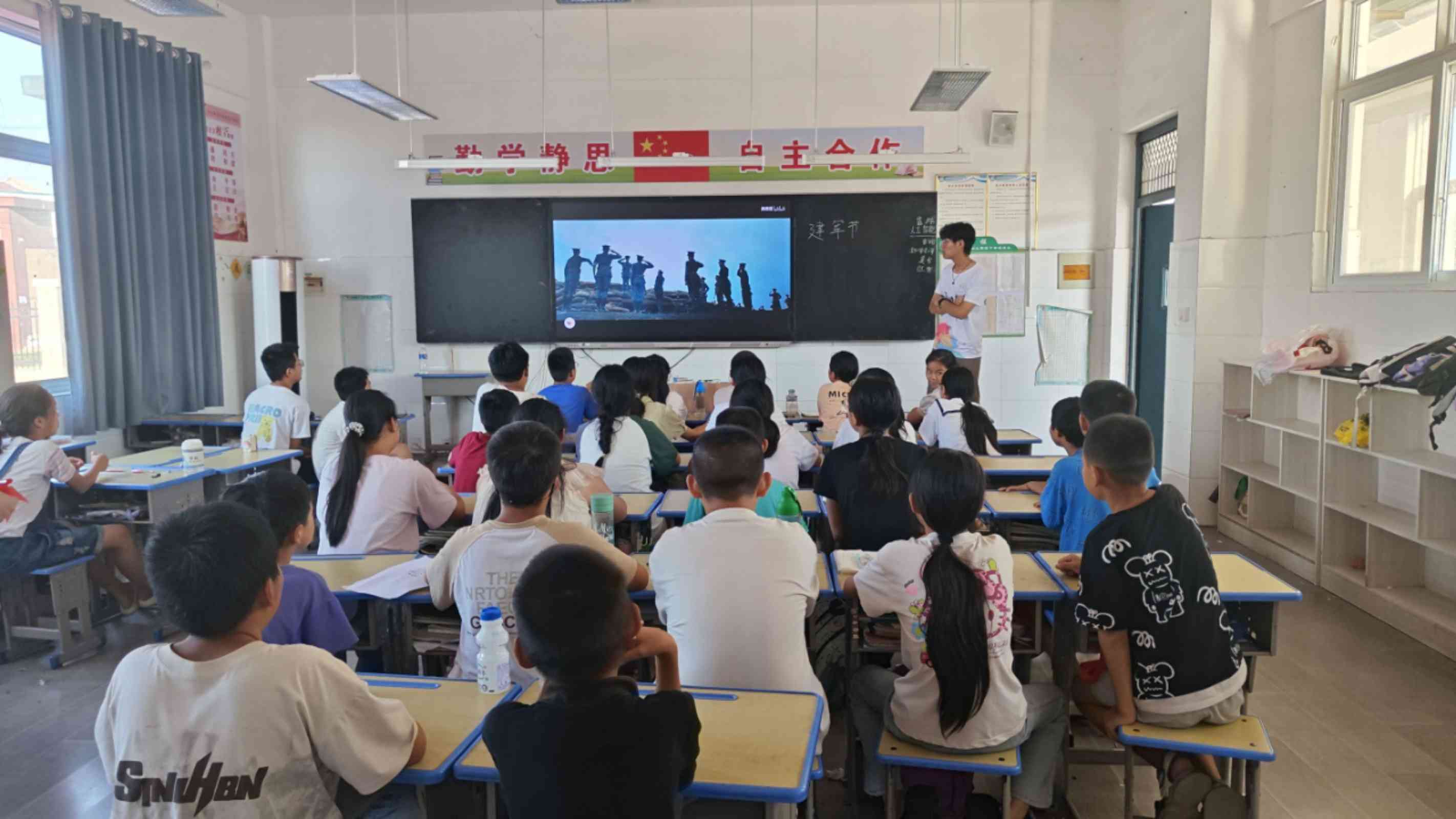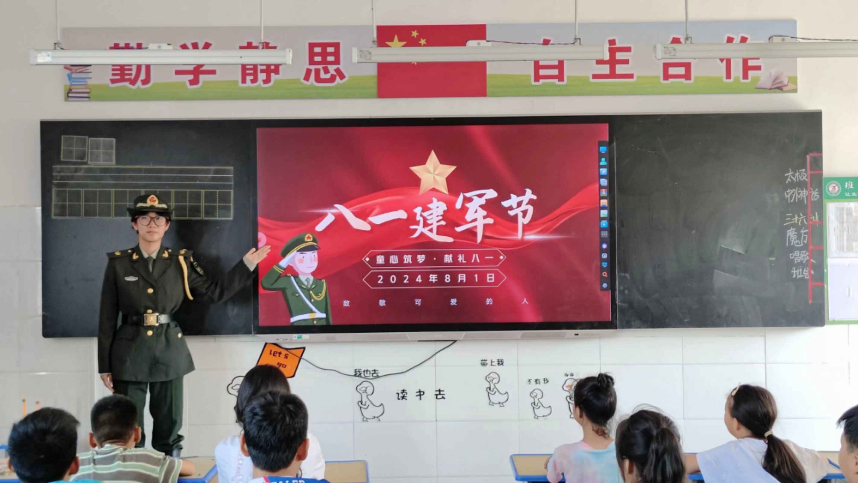 班會上,各班開展“小小衛(wèi)士·國防夢”專題活動。首先,主持人線上連線中國石油大學(華東)國旗護衛(wèi)隊隊長,由王隊作國防教育發(fā)言;其次,各班主講人講授建軍節(jié)相關(guān)的知識,國旗護衛(wèi)隊隊員兼支教隊隊長沈舒身著常服,為孩子們開啟紅色之旅,了解建軍節(jié)的歷史與中國軍種;然后,各班開展特色活動,低年級小朋友頭戴紅星發(fā)卡;三四年級小朋友分得專屬紅軍小書包,在隊長沈舒的帶領(lǐng)下,體驗升國旗儀式;五六年級小朋友制作紅色大風車,由支教隊員仇浩宇展示軍體拳,體驗立正、正步;最后,支教隊隊員和孩子們合影留念。國旗護衛(wèi)隊隊長的遠程寄語,如同穿越時空的號角,激蕩起孩子們對國家的崇敬與向往。紅軍小書包、紅星發(fā)卡、紅色大風車……一件件物品,承載著歷史的厚重與未來的希望,讓孩子們在升國旗的莊嚴儀式中,感受責任與榮耀;在軍體拳的剛勁有力中,體驗紀律與力量的美。最終,鏡頭定格,支教隊員與孩子們的笑臉交相輝映,定格了這個夏天最溫暖的記憶。