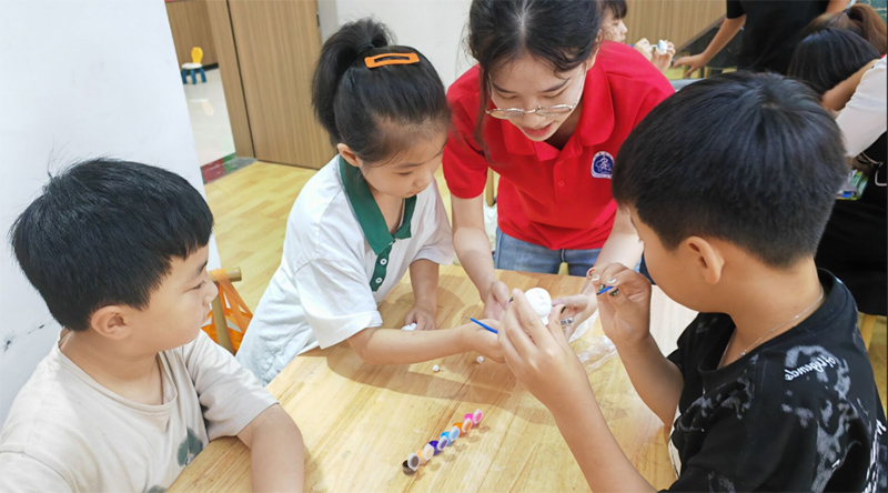 圖為“薪火筑夢,醫(yī)路鄉(xiāng)陽”社會(huì)實(shí)踐團(tuán)隊(duì)成員和小朋友們拿起畫筆,興致勃勃地投入到石膏娃娃的彩繪創(chuàng)作中。
