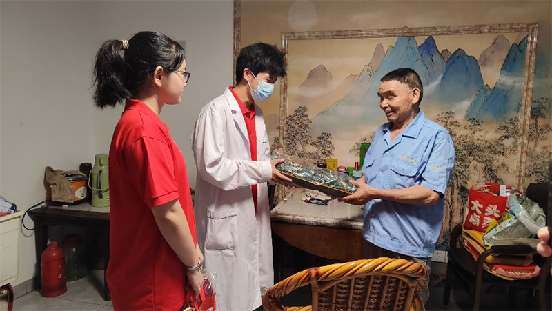 圖為“薪火筑夢,醫(yī)路鄉(xiāng)陽”社會(huì)實(shí)踐團(tuán)隊(duì)成員為特殊人員送禮品。