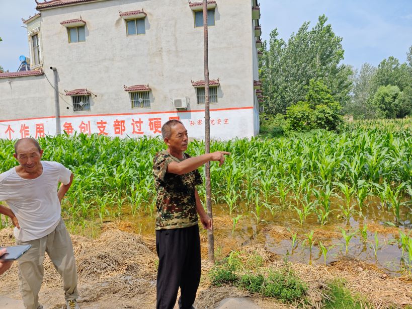 (圖為:孫聚寨鄉(xiāng)前后楊村村支書介紹農(nóng)田受災情況)