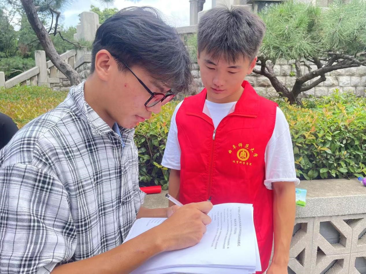 圖為實(shí)踐隊(duì)員和臨沂大學(xué)化學(xué)學(xué)院實(shí)踐隊(duì)進(jìn)行調(diào)查問卷分發(fā)情況高磊供圖