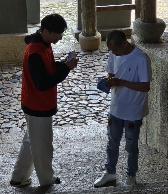 這些廊橋橫跨溪流之上,隱匿于群山之間,不僅解決了交通問題,更以其精美的木雕、石雕和彩繪藝術(shù),展現(xiàn)了古代工匠的卓越技藝和深厚文化底蘊(yùn)。走訪得知,廊橋不僅是村民們?nèi)粘I钪胁豢苫蛉钡囊徊糠郑青l(xiāng)村文化的重要載體。在鄉(xiāng)村振興的浪潮中,泰順廊橋得到了社會各界的廣泛關(guān)注和支持。團(tuán)隊(duì)成員也積極參與到當(dāng)?shù)氐南嚓P(guān)宣傳工作當(dāng)中,在北澗橋附近作為志愿者分發(fā)文物保護(hù)法規(guī),并且采訪了解不同職業(yè)和年齡的群體對于廊橋保護(hù)的知曉度,并向他們普及法規(guī)并簡單介紹廊橋,獲得了群眾的高度肯定。最后,實(shí)踐隊(duì)留下十余本宣傳小冊子在青年驛站供游人閱讀。