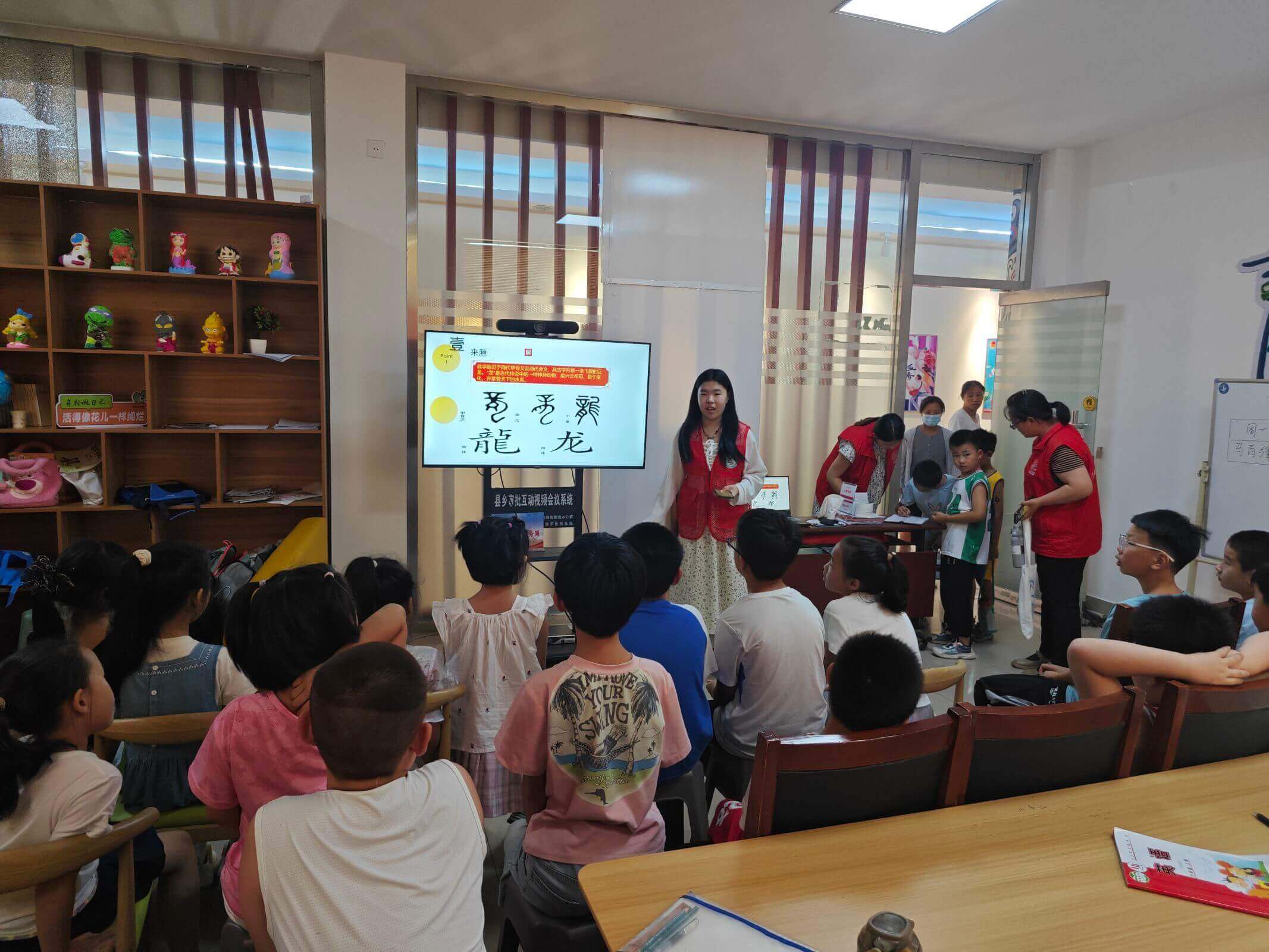 課程正式開始,授課人張寧宇首先用“龍”字的甲骨文引出話題,引導著孩子們猜測這個字的含義,孩子們踴躍回答,積極猜測,在老師耐心的引領下,他們終于成功得到了答案,龍的神秘傳說也在他們眼前娓娓道來,孩子們的小臉上滿是對龍的好奇以及對知識的渴求,中華傳統(tǒng)文化的魅力在孩子們的心中埋下了深深的種子。