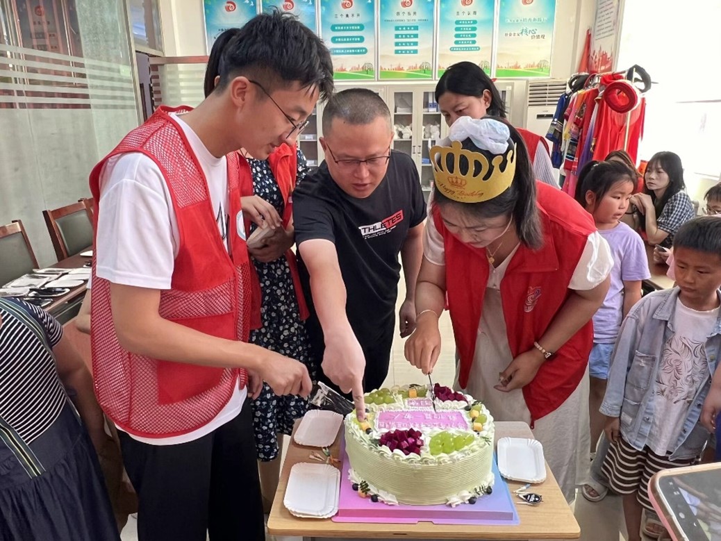 7月10日上午,德馨啟航支教隊隊員與社區(qū)工作人員共同度過了一個美好愉快的生日會。生日會上,在場所有人為社區(qū)工作人員田宇和支教隊隊長盧百帥共同慶賀生日,現(xiàn)場小朋友們圍成一圈蹦蹦跳跳,共唱生日快樂歌,大家一起切蛋糕,分享著生日的喜悅,現(xiàn)場和樂融融,每個人臉上都洋溢著幸福的笑容。