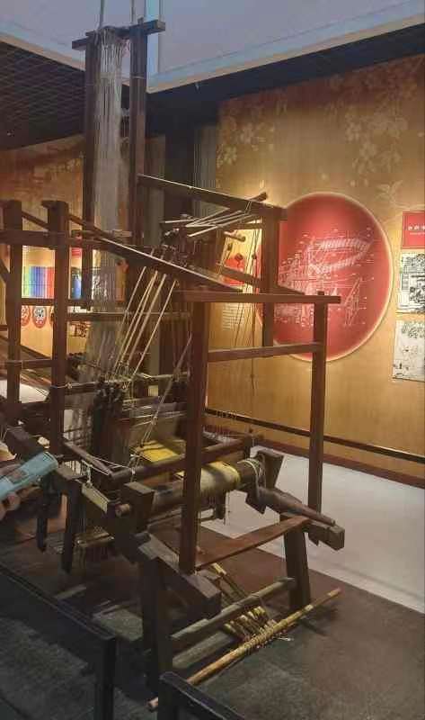 往前走,映入眼簾的是一臺(tái)云錦大花樓織布機(jī),構(gòu)造復(fù)雜、體型龐大,機(jī)子上面還纏繞了許多根根分明但又顯得雜亂無章的線,看的人眼花繚亂,著實(shí)摸不著頭腦。但是光看屬實(shí)是不知道究竟如何操作才能織造云錦,往前走幾步就聽到了“咯吱,咯吱……”的聲音,循著聲音看去是一臺(tái)正在運(yùn)行的云錦織布機(jī),這便是織造工藝的現(xiàn)場(chǎng)演示區(qū)。只不過這臺(tái)機(jī)子被一塊隔板擋著,只能在墻邊看到部分構(gòu)造,再加上人群的阻擋,我能看到的就更少了……隨著大花樓木質(zhì)提花