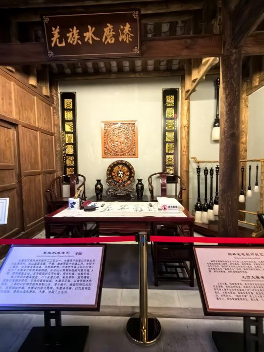 隨后,實(shí)踐隊(duì)員來(lái)到“羌族水磨漆器”展區(qū)。羌族水磨漆器,作為羌族文化中的瑰寶,其制作過(guò)程凝聚了無(wú)數(shù)匠人的智慧與汗水。從最初的打坯塑形,到精細(xì)的褙布上灰,再到繁復(fù)的水磨、上漆、繪制與拋光,整個(gè)過(guò)程竟有近八十道工序之多,每一步都如同精心雕琢的藝術(shù)品,承載著匠人對(duì)美的極致追求。展柜中,一件件精美的漆器作品熠熠生輝,它們不僅是有著實(shí)用的功能的器具,更是羌族人民智慧與創(chuàng)造力的結(jié)晶。那溫潤(rùn)細(xì)膩的觸感、光澤如鏡的表面,無(wú)不透露出匠人們對(duì)藝術(shù)的深刻理解。