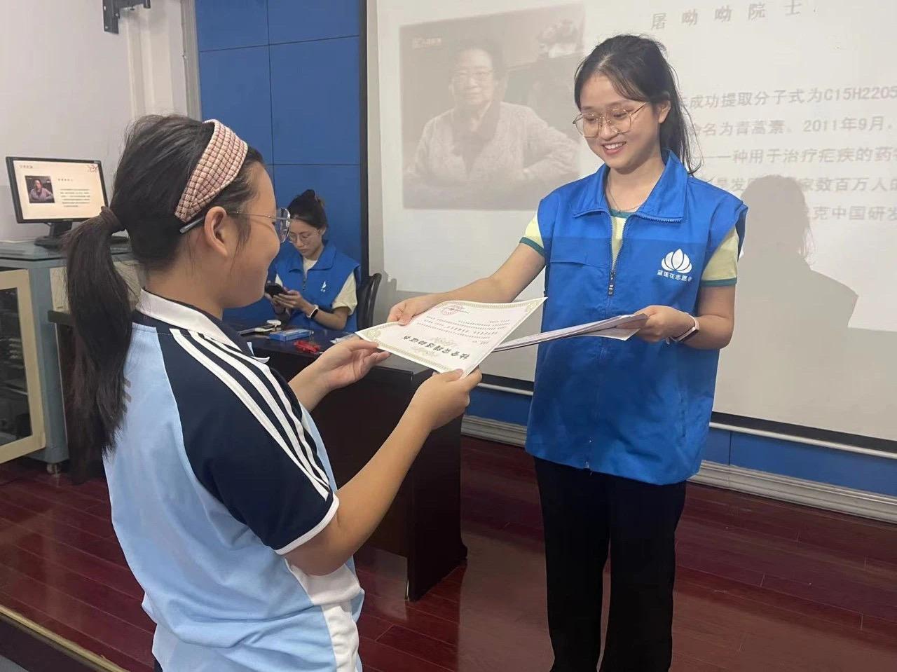 圖為志愿者為參與活動(dòng)的中小學(xué)生發(fā)放參與證書(shū)。 吳思遠(yuǎn) 供圖