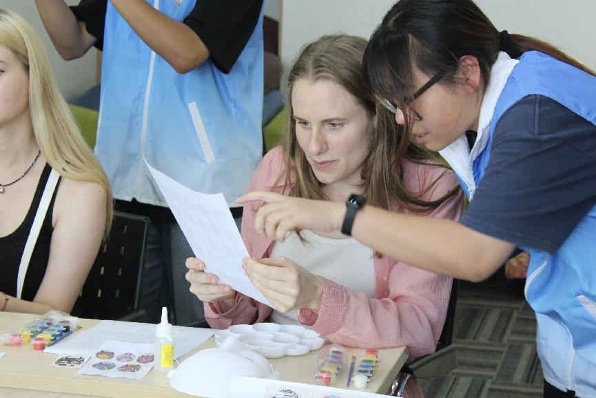 圖為實踐隊員向外國學(xué)生講解繪制臉譜教程 王書陽供圖