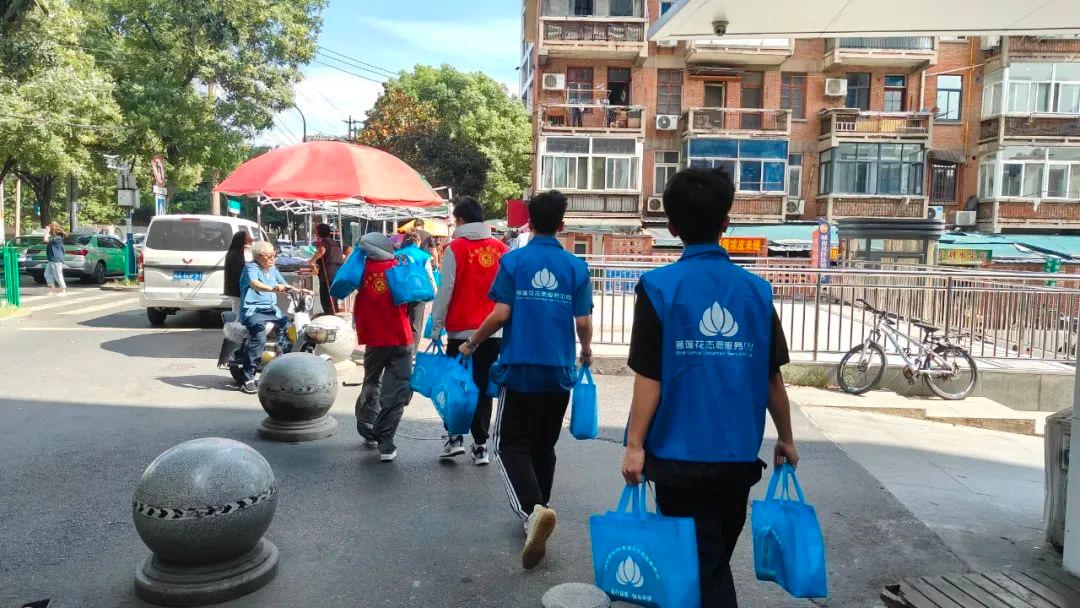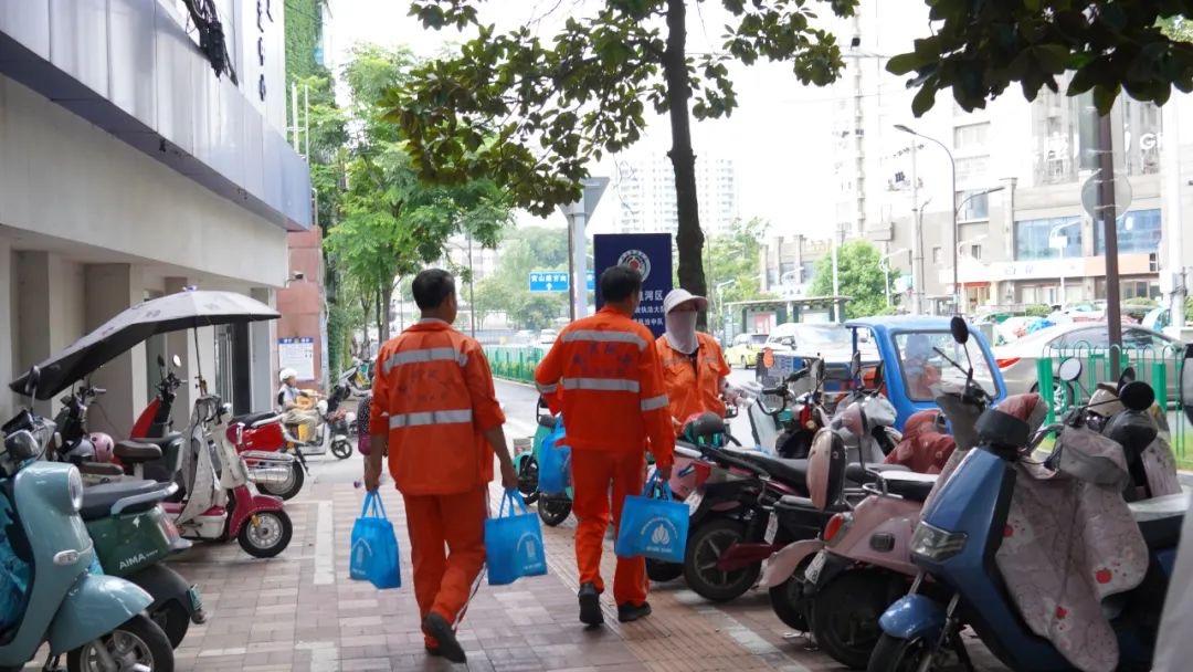 圖為志愿團(tuán)隊(duì)正手拎解暑物資,將其送往關(guān)愛(ài)人群的手中。 吳思遠(yuǎn) 拍攝