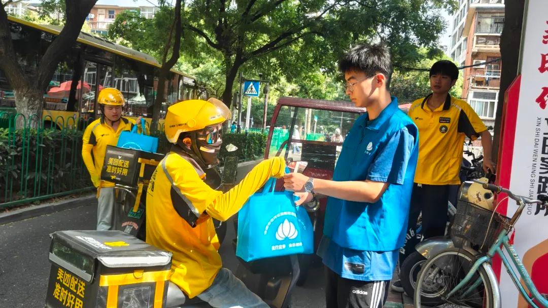 圖為志愿團(tuán)隊(duì)將解暑物資送給炎炎烈日下辛苦工作的外賣員們。 吳思遠(yuǎn) 拍攝
