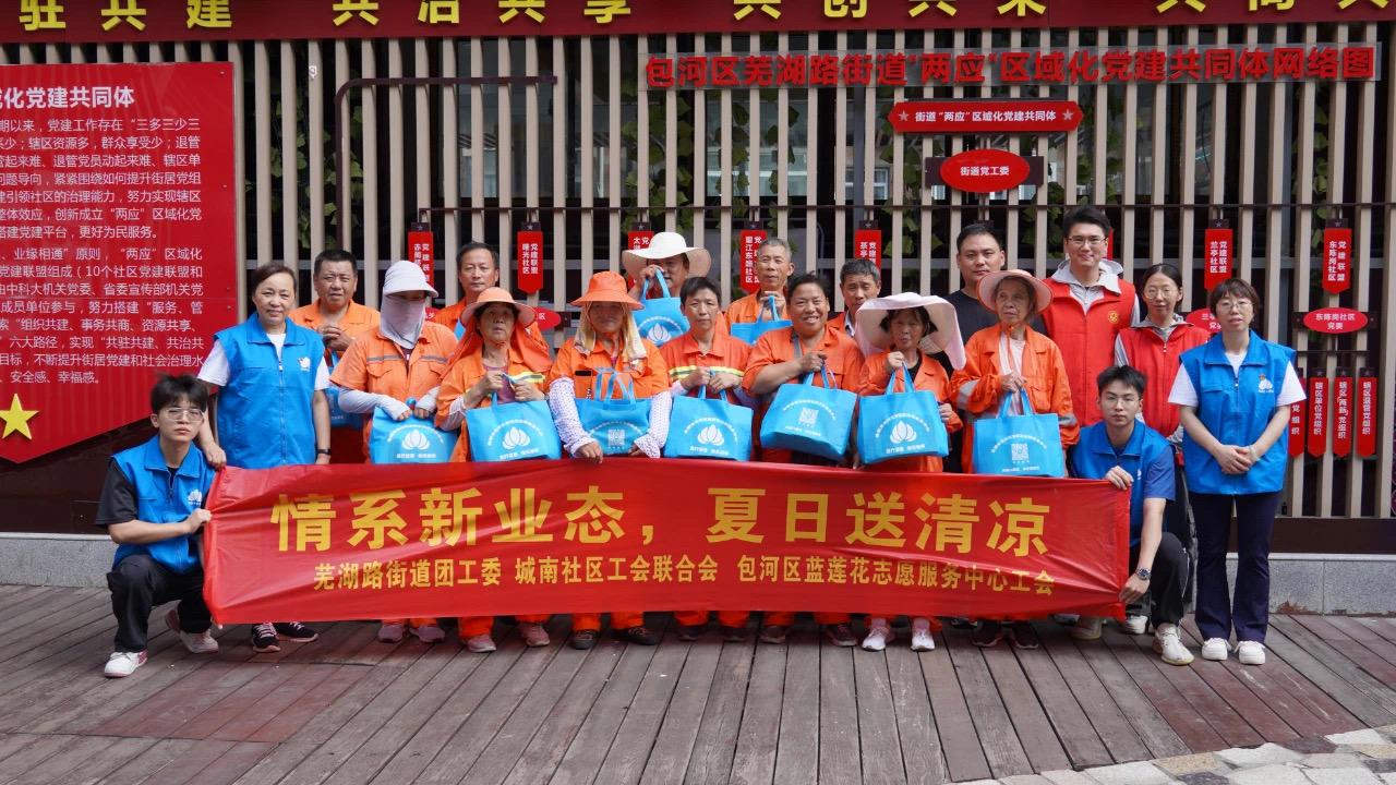 炎炎夏日,為了進(jìn)一步加大對(duì)快遞員,環(huán)衛(wèi)工人,外賣小哥等城市新就業(yè)群體的關(guān)心關(guān)愛(ài)力度,推動(dòng)新就業(yè)群體更好地融入基層社會(huì)治理,7月26日,安徽中醫(yī)藥大學(xué)志愿團(tuán)隊(duì)、城南社區(qū)工會(huì)聯(lián)合會(huì)、藍(lán)蓮花志愿服務(wù)中心工會(huì)聯(lián)合齊心共建,開展“夏日送清涼”活動(dòng),合成一股涼意,為新就業(yè)群體們驅(qū)散高溫天氣帶來(lái)的酷暑炎熱。