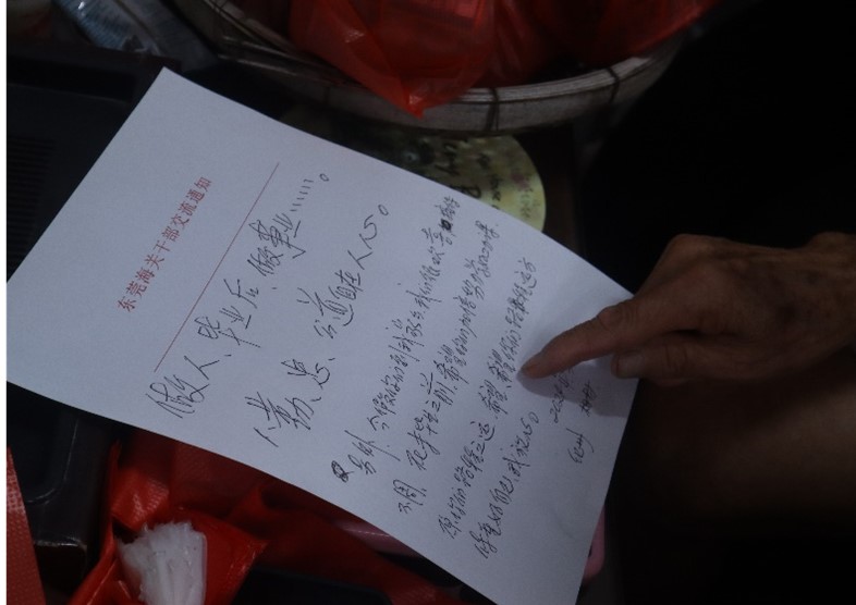 到桃姐與父親家中做客時,知薪實踐隊開啟直播與桃姐開展了訪談,深入了解幫助宣傳其父親的故事和五香粉的傳統(tǒng)工藝,直播反響熱烈,得到了桃姐與葉勝均爺爺一致夸贊。葉勝均爺爺張羅了一圍化州特色菜招待我們,以白斬雞為主菜,炒菜聲、刀與砧板的撞擊聲引出圍坐的歡聲笑語,熱鬧又親切。知薪青年離開時,葉爺爺拿出一張紙,顫顫巍巍寫下對我們溫暖而富有深意的期盼,為大家準備了近乎全國聞名的化州當?shù)靥厣a(chǎn)品——化橘紅(葉勝均60周年大壽紀念版)。