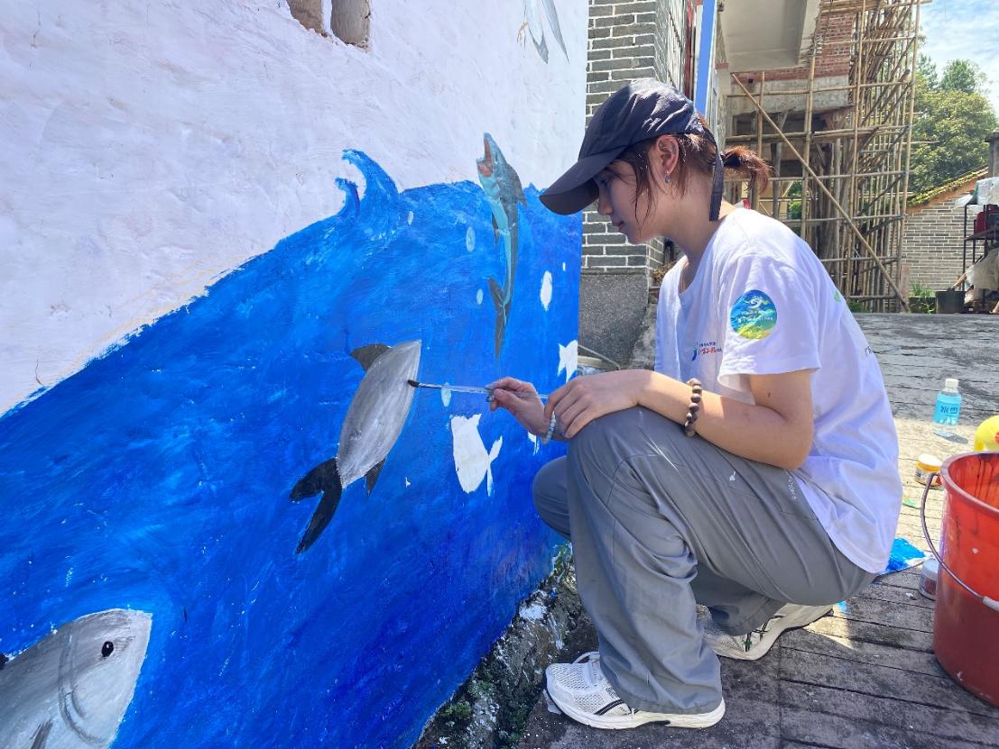 圖為實(shí)踐團(tuán)成員墻繪《相約都斛魚(yú)米之鄉(xiāng)》墻畫(huà)現(xiàn)場(chǎng)
