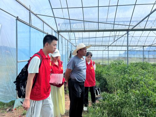 (圖為實(shí)踐團(tuán)成員與雙聯(lián)村鄧主任于辣椒大棚交流圖)
