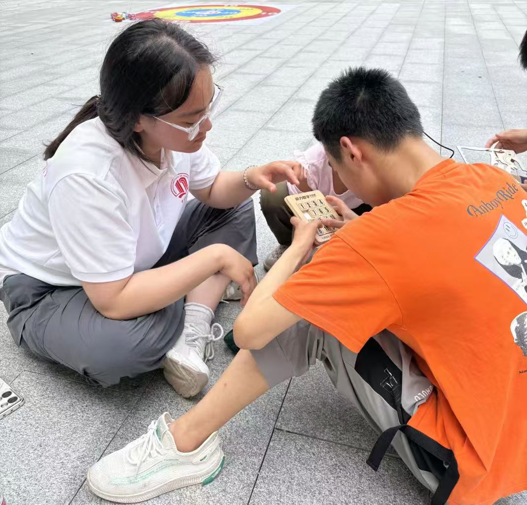圖為志愿者給學(xué)生介紹數(shù)字華容道的基本玩法。 管明浩 供圖