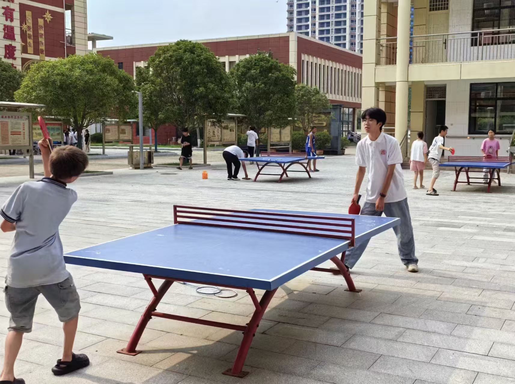 圖為志愿者與學(xué)生們在乒乓球臺上比拼球藝。 柴灝明 供圖
