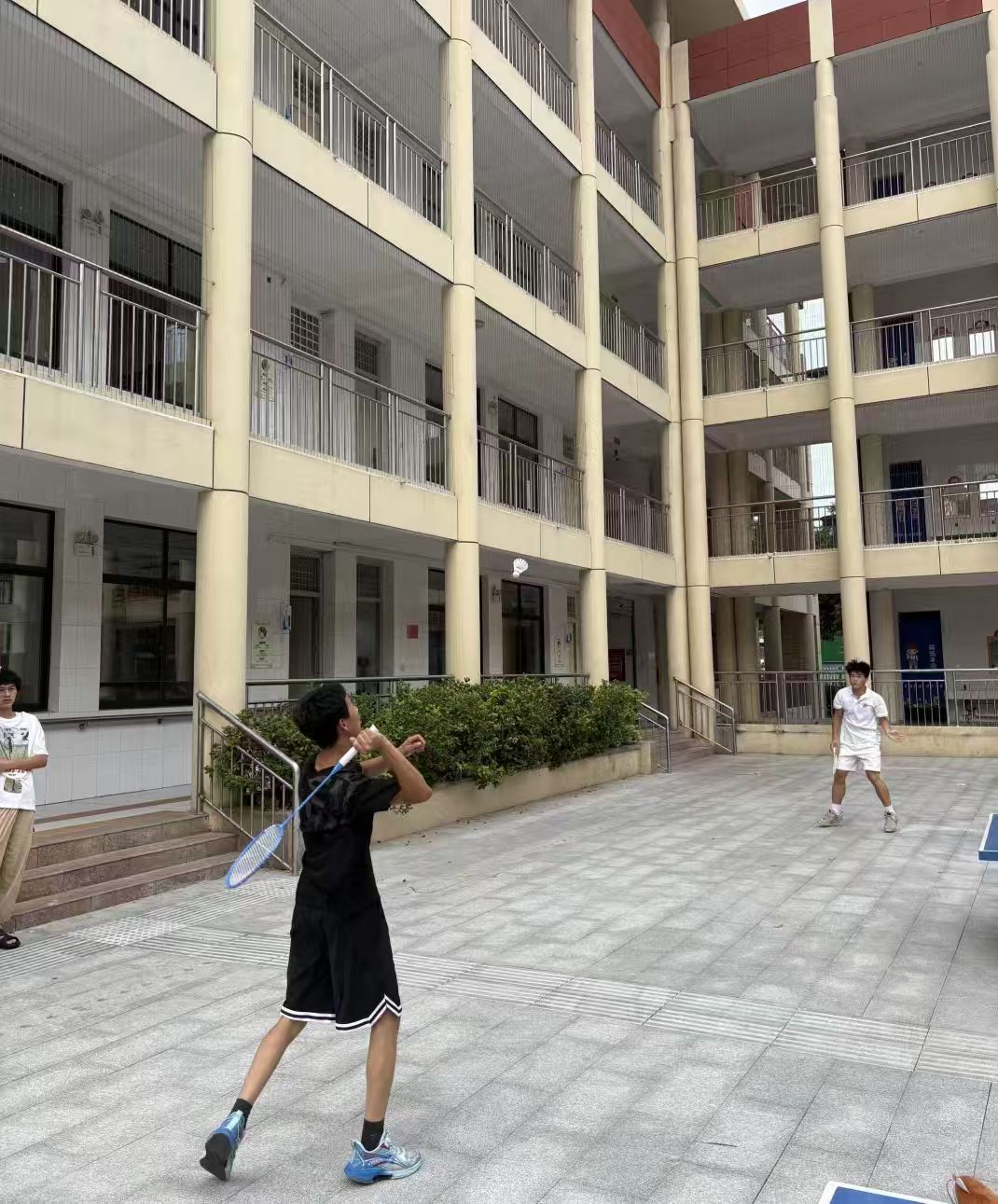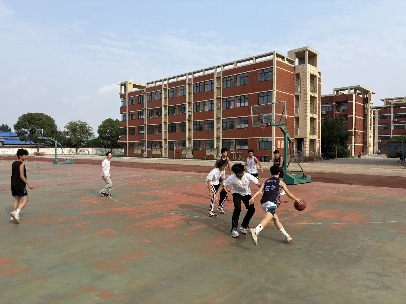 圖為志愿者與學(xué)生們在籃球場上揮灑汗水。 王心語 供圖