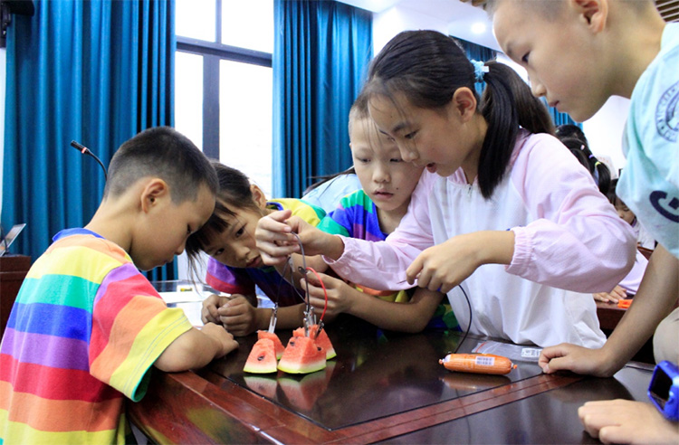最令小朋友們興奮的水果電池實驗環(huán)節(jié),將活動推向了高潮。志愿者們拿出提前準備好的西瓜、銅片、鋅片和導線,耐心地講解和演示,隨著線路連接完成,普通的水果竟讓小燈泡散發(fā)出光芒。“哇!太神奇了!”小朋友們瞪大眼睛,發(fā)出此起彼伏的驚嘆,眼神中滿是對科學奧秘的好奇。小朋友們迫不及待想要自己制作,他們分組行動,小心翼翼地將金屬片插入水果,專注地連接導線,緊張地注視著燈泡,當親手制作的水果電池成功點亮燈泡時,小朋友們激動不已,爭相與同伴分享成功的喜悅。“謝謝哥哥姐姐!這個實驗太有趣了,我回家也要做給爸爸媽媽看!”幾位小朋友難掩激動地說道。
