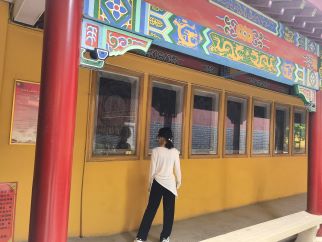 實踐隊隊員們來到龍泉禪寺南門。首先,觀賞九龍壁,上面九條游龍破壁欲出,青赤金白諸色交融,鱗片與云紋分毫畢現(xiàn),在日光里漾起千年古韻。接著,踏入南門,隊員們隨講解員穿梭天王殿、大雄寶殿,殿內(nèi)佛像莊嚴,經(jīng)幡輕拂,歷史與信仰在此交織;探尋龍泉、御井遺存,聽泉水叮咚訴說往昔故事,從建筑規(guī)制到人文傳說,一步步解鎖古寺文化密碼,沉浸式感知宗教文化與地域發(fā)展的深層聯(lián)結(jié)。