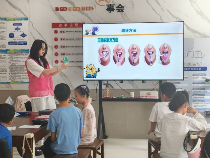 宣講尾聲,志愿者將重點(diǎn)落在正確刷牙方法的教學(xué)上。配合生動(dòng)形象的示意圖,志愿者舉起牙齒模型,現(xiàn)場(chǎng)演示巴氏刷牙法的關(guān)鍵動(dòng)作:“大家看,上牙要往下刷,下牙要往上刷,牙齒咬合面要來回刷,每個(gè)部位都不能漏掉,每次都要刷滿3分鐘。”孩子們專注地盯著模型,有的還跟著舉起小手比劃刷牙動(dòng)作,現(xiàn)場(chǎng)充滿互動(dòng)樂趣。志愿者用通俗的語言將口腔的專業(yè)知識(shí)轉(zhuǎn)化為易懂的叮囑,讓“堅(jiān)持科學(xué)刷牙、做好口腔護(hù)理”的觀念在互動(dòng)中深深扎根。