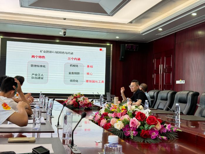 行政管理中心周璜經(jīng)理為實(shí)踐團(tuán)詳細(xì)介紹了公司的“礦業(yè)管理4.0”體系。作為推動(dòng)管理升級(jí)的系統(tǒng)化工具,礦業(yè)管理4.0以“管理標(biāo)準(zhǔn)化”為核心,以“產(chǎn)業(yè)工人隊(duì)伍建設(shè)”為支撐,是在前期標(biāo)準(zhǔn)化管理基礎(chǔ)上的全面升級(jí)。