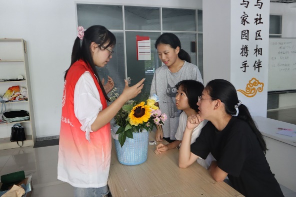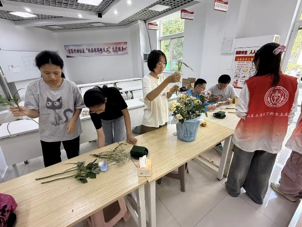 2025年8月21日,為緩解青少年學(xué)業(yè)壓力,通過(guò)美育鍛煉其創(chuàng)造性思維、提升他們的專(zhuān)注力,山東大學(xué)護(hù)理與康復(fù)學(xué)院南丁格爾志愿服務(wù)隊(duì)志愿者王雅潤(rùn)老師為社區(qū)同學(xué)們帶來(lái)一節(jié)花藝沙龍課程。從最基礎(chǔ)的認(rèn)識(shí)花材開(kāi)始,孩子們眼里充滿著好奇與期待。在簡(jiǎn)單了解了插花的基本類(lèi)型、基本方法以及基本思路后,同學(xué)們迫不及待地開(kāi)始動(dòng)手嘗試,創(chuàng)作自己的作品。