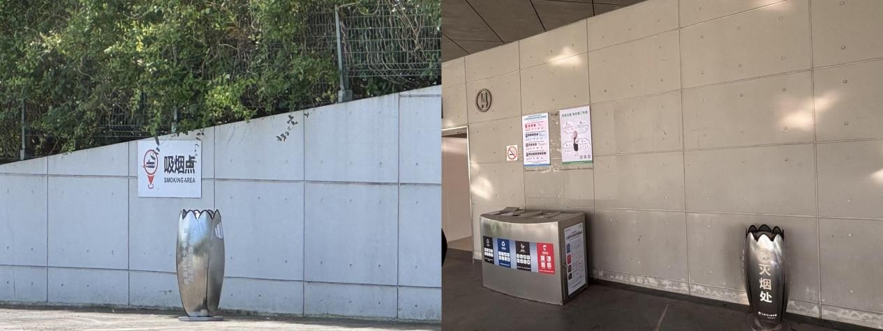 團隊發(fā)現(xiàn),園區(qū)禁煙標(biāo)識數(shù)量少且位置隱蔽,更存在與“全面禁煙”政策相悖的不規(guī)范吸煙點——一處緊鄰檢票排隊區(qū),另一處僅在洗手間門口設(shè)置滅煙柱充當(dāng)“吸煙點”,均不符合上海市室外吸煙點設(shè)置標(biāo)準(zhǔn)。當(dāng)團隊向工作人員反映時,得到的回應(yīng)卻是“園區(qū)太大管不過來”,“主要靠自覺”,凸顯出管理執(zhí)行的乏力。